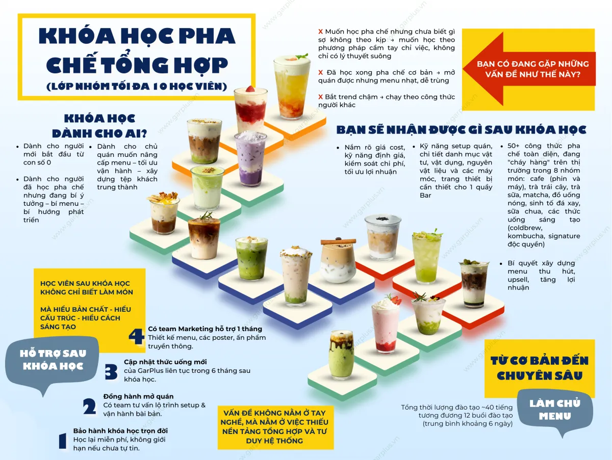 GarPlus không đào tạo bạn trở thành người pha chế giỏi trong quầy bar, mà là người làm chủ quầy – làm chủ menu – làm chủ doanh thu.